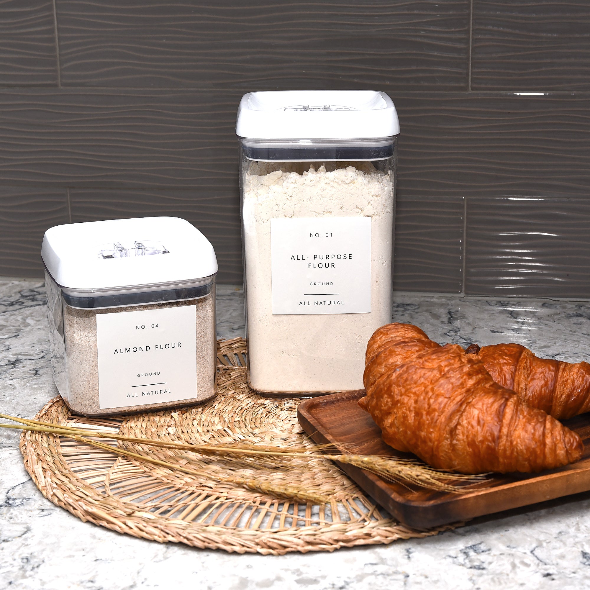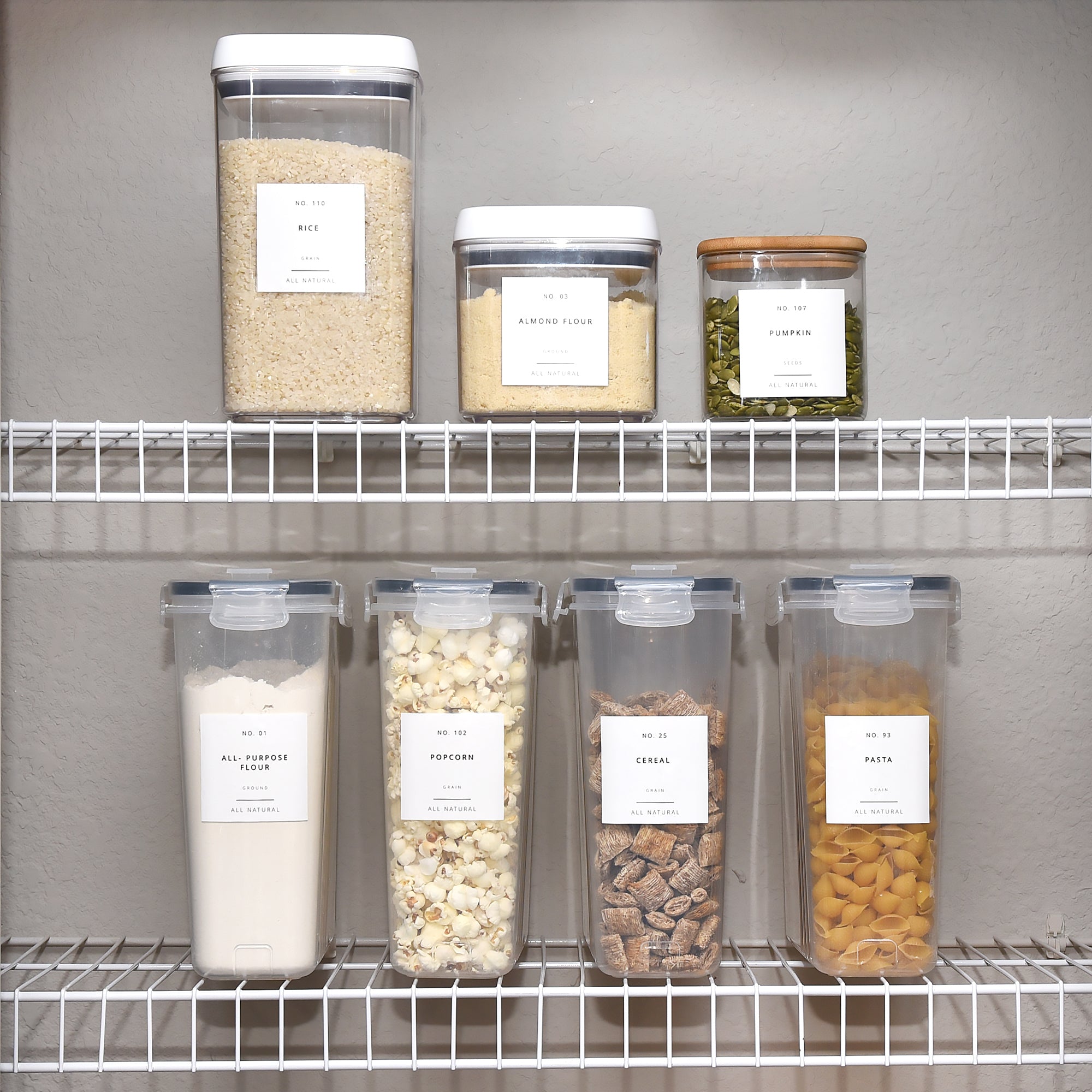 The pre-printed labels feature commonly used pantry items, making it easy to organize everything from cereals and grains to baking supplies and snacks. The modern design and clear font make it easy to identify items at a glance, improving the efficiency and aesthetic of your kitchen.